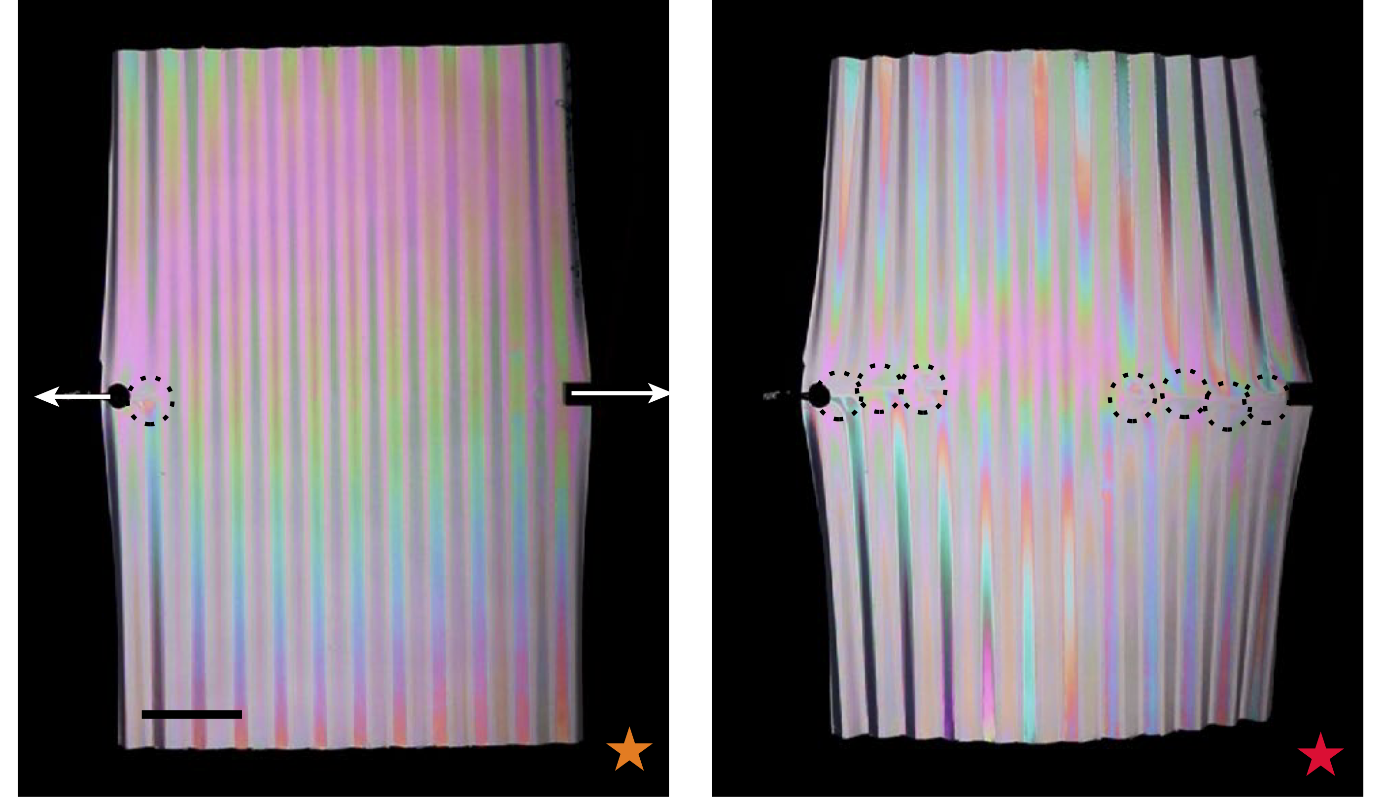 A characteristic length scale causes anomalous size effects and boundary programmability in mechanical metamaterialsBastiaan Florijn, Chris Kettenis, and Martin van HeckeNature Physics - (2018) [pdf]The architecture of mechanical metamaterials is designed to harness geometry, nonlinearity and topology to obtain advanced functionalities such as shape morphing, programmability and one-way propagation. Although a purely geometric framework successfully captures the physics of small systems under idealized conditions, large systems or heterogeneous driving conditions remain essentially unexplored. Here we uncover strong anomalies in the mechanics of a broad class of metamaterials, such as auxetics, shape changers or topological insulators; a non-monotonic variation of their stiffness with system size, and the ability of textured boundaries to completely alter their properties. These striking features stem from the competition between rotation-based deformations—relevant for small systems—and ordinary elasticity, and are controlled by a characteristic length scale which is entirely tunable by the architectural details. Our study provides new vistas for designing, controlling and programming the mechanics of metamaterials. ![]() A characteristic length scale causes anomalous size effects and boundary programmability in mechanical metamaterialsBastiaan Florijn, Chris Kettenis, and Martin van HeckeNature Physics - (2018) [pdf]The architecture of mechanical metamaterials is designed to harness geometry, nonlinearity and topology to obtain advanced functionalities such as shape morphing, programmability and one-way propagation. Although a purely geometric framework successfully captures the physics of small systems under idealized conditions, large systems or heterogeneous driving conditions remain essentially unexplored. Here we uncover strong anomalies in the mechanics of a broad class of metamaterials, such as auxetics, shape changers or topological insulators; a non-monotonic variation of their stiffness with system size, and the ability of textured boundaries to completely alter their properties. These striking features stem from the competition between rotation-based deformations—relevant for small systems—and ordinary elasticity, and are controlled by a characteristic length scale which is entirely tunable by the architectural details. Our study provides new vistas for designing, controlling and programming the mechanics of metamaterials. ![]() |