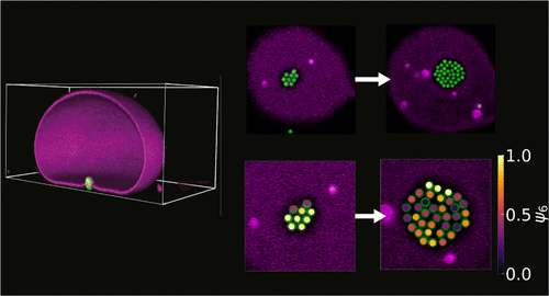 Nonadditivity in Many-Body Interactions between Membrane-Deforming Spheres Increases DisorderAli Azadbakht, Thomas R Weikl, and Daniela J KraftACS nano - (2024) [arXiv] [pdf]Membrane-induced interactions play an important role in organizing membrane proteins. Measurements of the interactions between two and three membrane deforming objects have revealed their nonadditive nature. They are thought to lead to complex many-body effects, however, experimental evidence is lacking. We here present an experimental method to measure many-body effects in membrane-mediated interactions using colloidal spheres placed between a deflated giant unilamellar vesicles and a planar substrate. The confined colloidal particles cause a large deformation of the membrane while not being physicochemically attached to it and interact through it. Two particles attract with a maximum force of 0.2 pN. For three particles, compact equilateral triangles were preferred over linear arrangements. We use numerical energy minimization to establish that the attraction stems from a reduction in the membrane-deformation energy caused by the particles. Confining up to 36 particles, we find a preference for hexagonally close packed clusters. However, with increasing number of particles the order of the confined particles decreases, at the same time, diffusivity of the particles increases. Our experiments show that the nonadditive nature of membrane-mediated interactions affects the interactions and arrangements and ultimately leads to spherical aggregates with liquid-like order of potential importance for cellular processes. ![]() Nonadditivity in Many-Body Interactions between Membrane-Deforming Spheres Increases DisorderAli Azadbakht, Thomas R Weikl, and Daniela J KraftACS nano - (2024) [arXiv] [pdf]Membrane-induced interactions play an important role in organizing membrane proteins. Measurements of the interactions between two and three membrane deforming objects have revealed their nonadditive nature. They are thought to lead to complex many-body effects, however, experimental evidence is lacking. We here present an experimental method to measure many-body effects in membrane-mediated interactions using colloidal spheres placed between a deflated giant unilamellar vesicles and a planar substrate. The confined colloidal particles cause a large deformation of the membrane while not being physicochemically attached to it and interact through it. Two particles attract with a maximum force of 0.2 pN. For three particles, compact equilateral triangles were preferred over linear arrangements. We use numerical energy minimization to establish that the attraction stems from a reduction in the membrane-deformation energy caused by the particles. Confining up to 36 particles, we find a preference for hexagonally close packed clusters. However, with increasing number of particles the order of the confined particles decreases, at the same time, diffusivity of the particles increases. Our experiments show that the nonadditive nature of membrane-mediated interactions affects the interactions and arrangements and ultimately leads to spherical aggregates with liquid-like order of potential importance for cellular processes. ![]() |