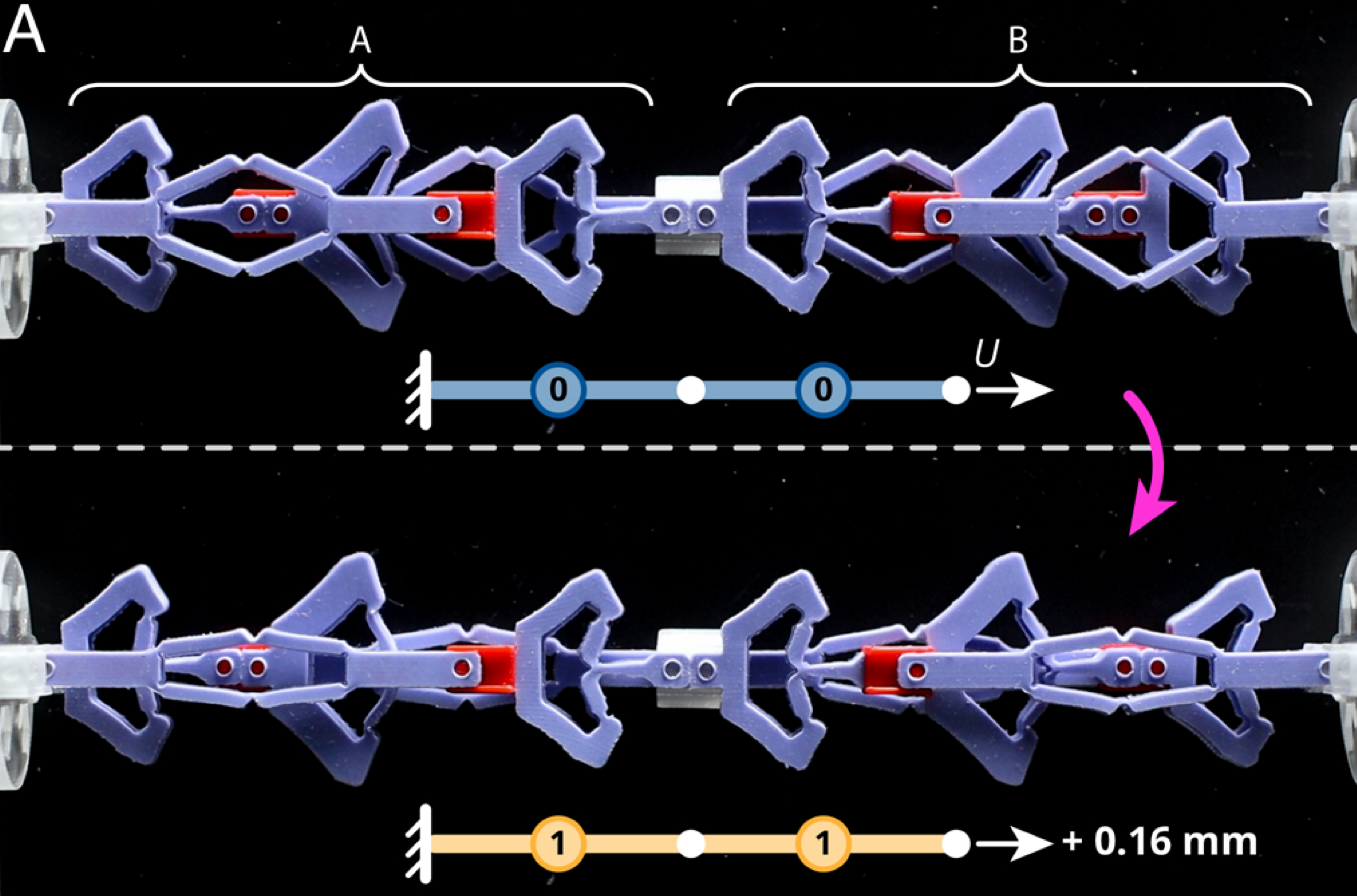 Controlled pathways and sequential information processing in serially coupled mechanical hysteronsJingran Liu, Margot Teunisse, George Korovin, Ivo R Vermaire, Lishuai Jin, Hadrien Bense, and Martin van HeckeProceedings of the National Academy of Sciences - (2024)The complex sequential response of frustrated materials results from the interactions between material bits called hysterons. Hence, a central challenge is to understand and control these interactions, so that materials with targeted pathways and functionalities can be realized. Here, we show that hysterons in serial configurations experience geometrically controllable antiferromagnetic-like interactions. We create hysteron-based metamaterials that leverage these interactions to realize targeted pathways, including those that break the return point memory property, characteristic of independent or weakly interacting hysterons. We uncover that the complex response to sequential driving of such strongly interacting hysteron-based materials can be described by finite state machines. We realize information processing operations such as string parsing in materia, and outline a general framework to uncover and characterize the FSMs for a given physical system. Our work provides a general strategy to understand and control hysteron interactions, and opens a broad avenue toward material-based information processing. ![]() Controlled pathways and sequential information processing in serially coupled mechanical hysteronsJingran Liu, Margot Teunisse, George Korovin, Ivo R Vermaire, Lishuai Jin, Hadrien Bense, and Martin van HeckeProceedings of the National Academy of Sciences - (2024)The complex sequential response of frustrated materials results from the interactions between material bits called hysterons. Hence, a central challenge is to understand and control these interactions, so that materials with targeted pathways and functionalities can be realized. Here, we show that hysterons in serial configurations experience geometrically controllable antiferromagnetic-like interactions. We create hysteron-based metamaterials that leverage these interactions to realize targeted pathways, including those that break the return point memory property, characteristic of independent or weakly interacting hysterons. We uncover that the complex response to sequential driving of such strongly interacting hysteron-based materials can be described by finite state machines. We realize information processing operations such as string parsing in materia, and outline a general framework to uncover and characterize the FSMs for a given physical system. Our work provides a general strategy to understand and control hysteron interactions, and opens a broad avenue toward material-based information processing. ![]() |